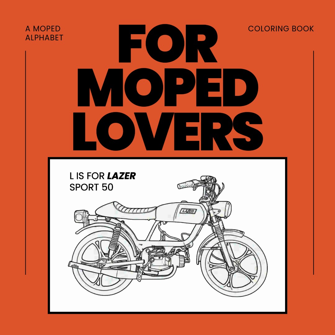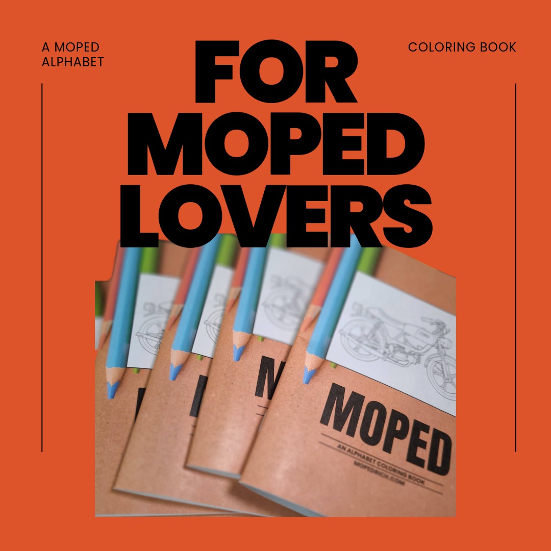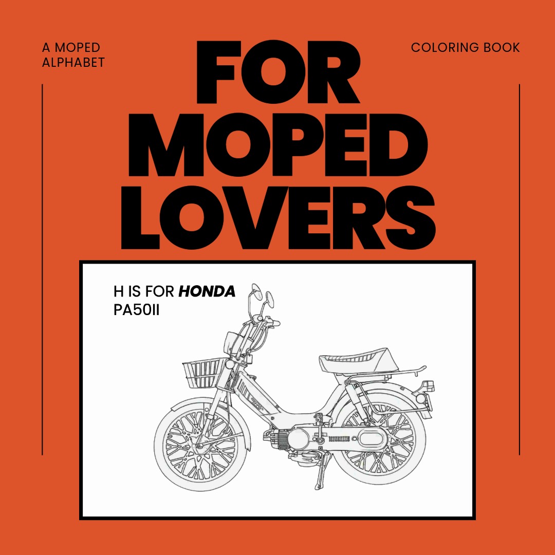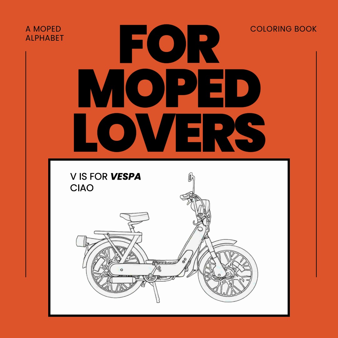 Cruise and unwind with the Moped Coloring Book! This isn’t just a coloring book—it’s a garage escape. Featuring a basic line drawing of a moped for every letter of the alphabet, this book provides the perfect, low-stress outlet to decompress or even test out color schemes for your next vintage build. Perfect for moped lovers and coloring fans of all ages.